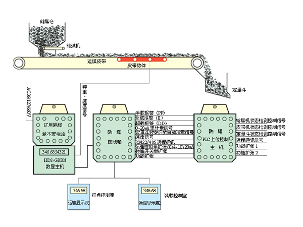 系統(tǒng)設(shè)備組成:礦用電子皮帶秤秤體、稱重傳感器、礦用電子皮帶秤數(shù)顯分機(jī)、定量裝載型控制接線箱、本安型遠(yuǎn)端裝載量顯示表系統(tǒng)特點(diǎn)及功能實(shí)現(xiàn):1、 可對(duì)主井提升箕斗裝煤量進(jìn)行定量控制:(PP、II、dd量值可在現(xiàn)場憑密碼 任意設(shè)定)2、 可采用通訊、模擬量、開關(guān)量等方式向主井裝載信號(hào)控制系統(tǒng)發(fā)送實(shí)時(shí)裝載量,主井信號(hào)控制系統(tǒng)PLC主機(jī)采集裝載信號(hào)后,按一定的程序?qū)φ麄€(gè)裝載過程(定量斗、給煤機(jī)、皮帶)進(jìn)行安全有效的控制。3、 對(duì)定量斗裝煤量進(jìn)行有效的監(jiān)控,以免定量斗因故障引起提升箕斗機(jī)超、欠載運(yùn)行,同時(shí)起到定量斗裝載的前端保護(hù),保障主井提煤系統(tǒng)安全可靠的運(yùn)行。4、 通過累計(jì)裝載次數(shù),可準(zhǔn)確計(jì)量出整個(gè)煤礦班、日、月 年的產(chǎn)煤量。5、 定量裝載礦用電子皮帶秤安裝在裝載皮帶上,比較靠近甲帶給煤機(jī)附近,在給箕斗定量裝載時(shí)最先獲取準(zhǔn)確裝載量,并將裝載量及時(shí)反饋給上位PLC信號(hào)控制系統(tǒng),主井信號(hào)控制系統(tǒng)對(duì)裝載用的甲帶給煤機(jī)停止信號(hào),完成整個(gè)箕斗定量裝載過程。在整個(gè)裝載信號(hào)控制系統(tǒng)過程中,定量裝載礦用電子皮帶秤也可以自行控制甲帶給煤機(jī)的啟停狀態(tài)。6、 預(yù)留遠(yuǎn)程通訊接口和技術(shù)支持,以便產(chǎn)品更好的升級(jí)。
